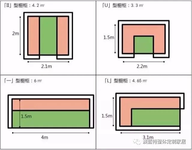 “I”:6㎡> “L”:4.65㎡ >“II”:4.2㎡ >“U”:3.3㎡,從(cóng)圖片上(shàng)也(yě)可(kě)以看(kàn)到(dào),當紅(h$óng)色面積(櫥櫃)不(bù)變時(shí),綠(lǜ)色的(de)面積(通(tōng)道(dào))越小(xiǎo),廚房(fáng)的(de)≈占地(dì)面積就(jiù)越小(xiǎo)。