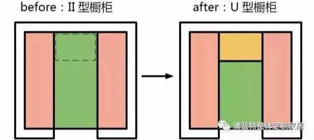 在同一(yī)個(gè)廚房(fáng)中,将“II”型櫥櫃的(de)一(yī)側通(tōng)道(dào)補上(shàng),就(jiù)變成了(le™)“U”型櫥櫃,補上(shàng)的(de)這(zhè)一(yī)段可(kě)以為(wèi)我們增加大(dà)約0.9米的(de)櫥櫃長(cháng)$度。